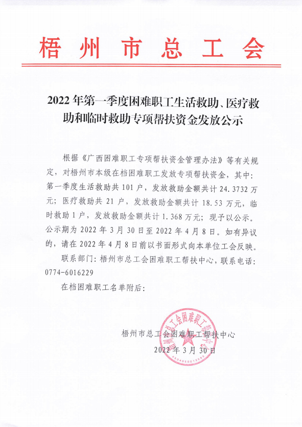2022年第一季度困難職工生活救助、醫(yī)療救助和臨時救助專項(xiàng)幫扶資金發(fā)放公示