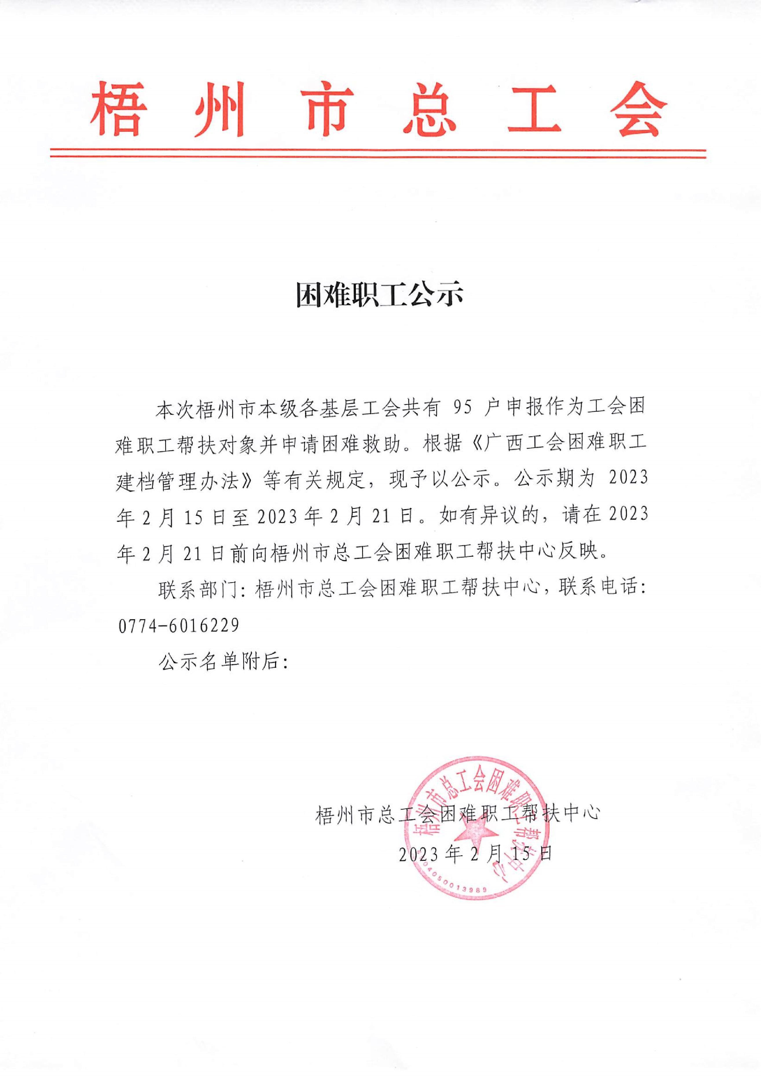來源:梧州市總工會困難職工幫扶中心   作者:   瀏覽:次   發(fā)表時間:2023-02-15 10:07:40