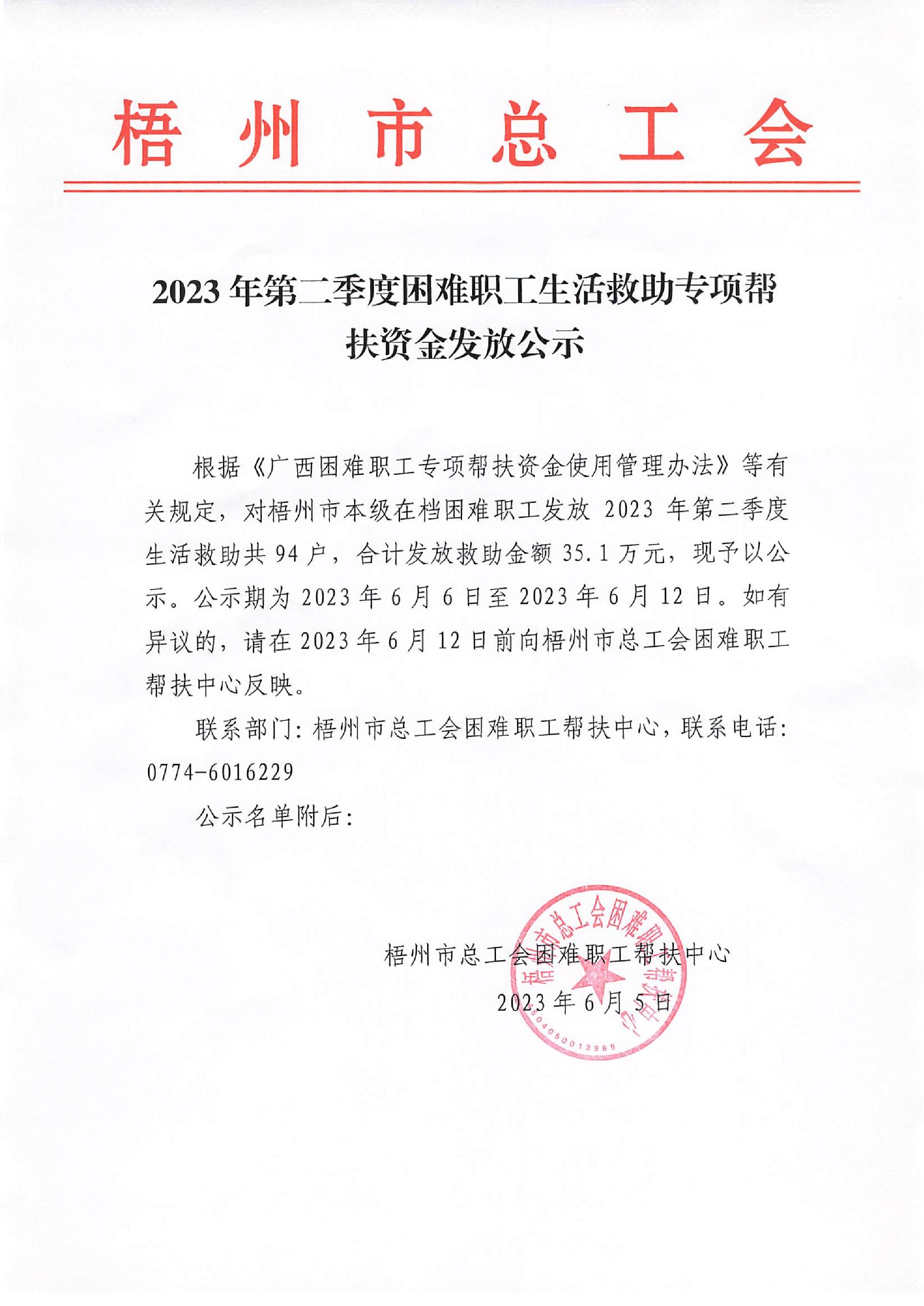 2023年第二季度困難職工生活救助專項幫扶資金發(fā)放公示