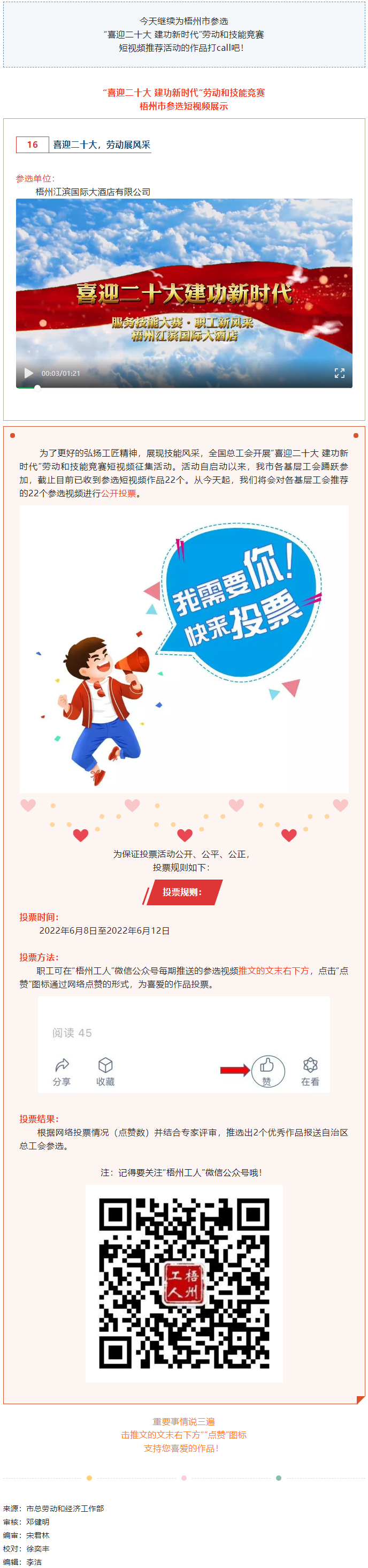 梧州江濱國(guó)際大酒店參選作品丨“喜迎二十大 建功新時(shí)代” 勞動(dòng)和技能競(jìng)賽短視頻投票活動(dòng)開(kāi)始啦!