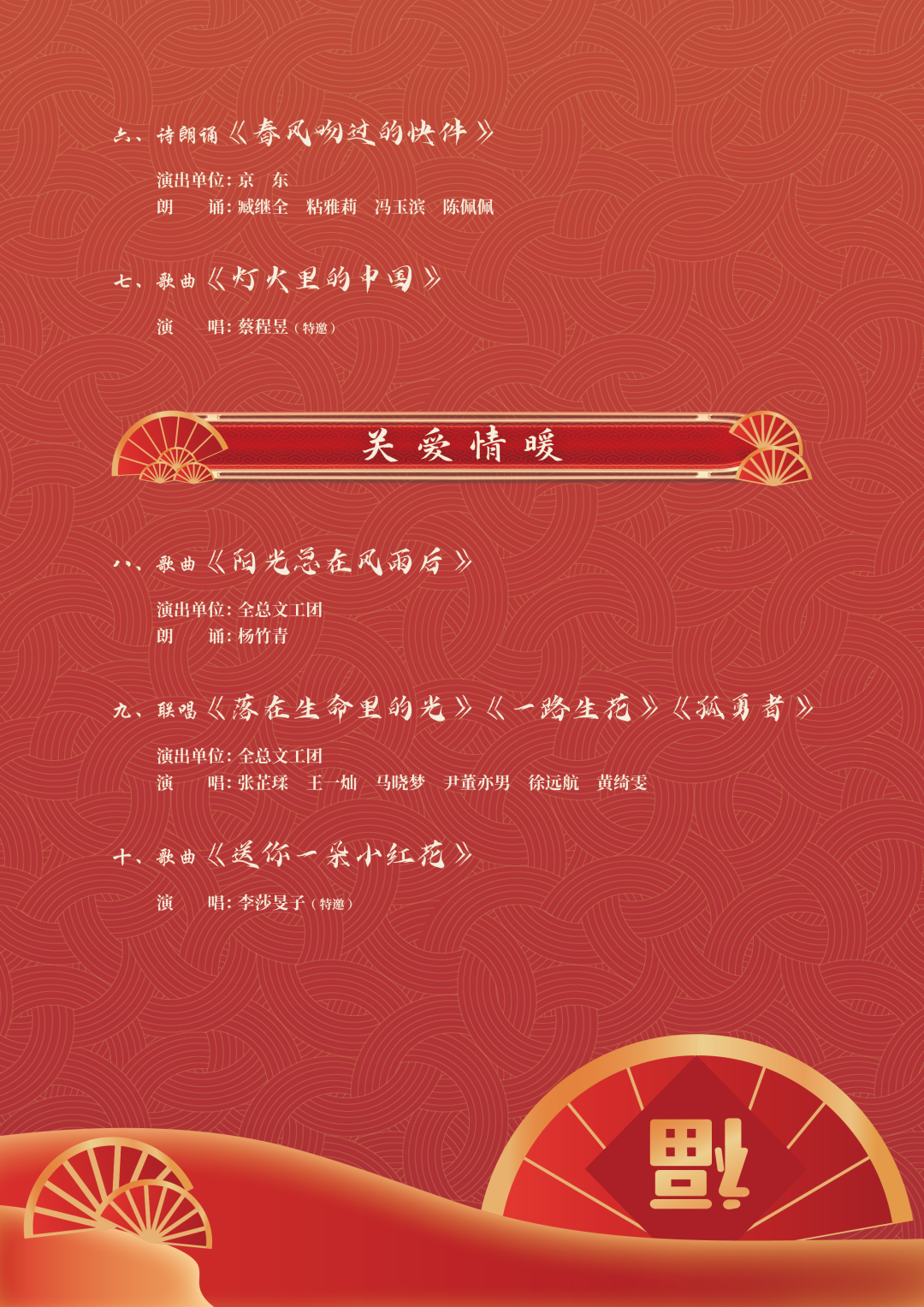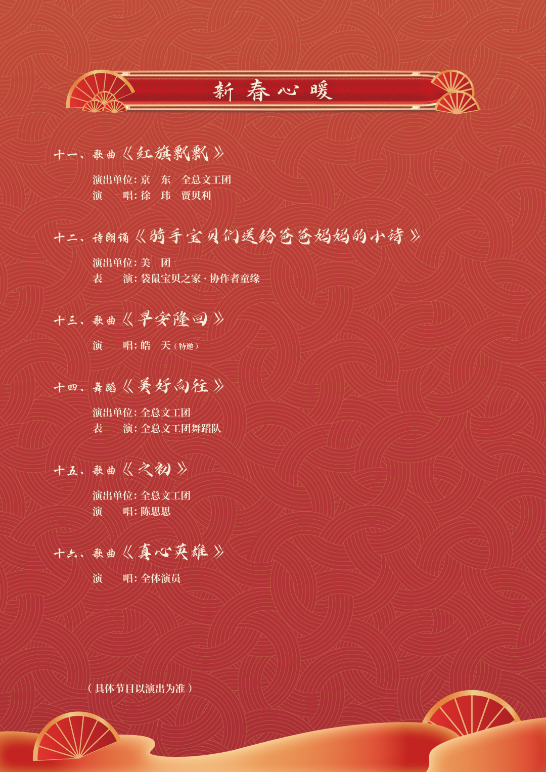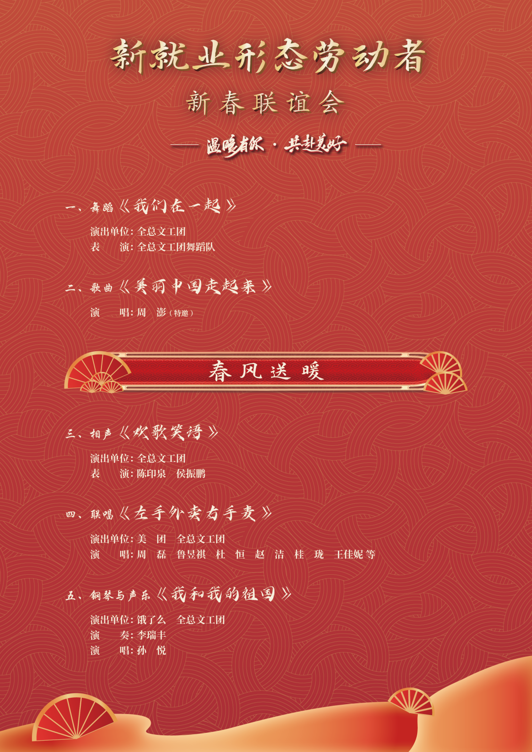 此次活動(dòng)以“溫暖有你 共赴美好”為主題,突出喜慶、溫暖、美好的主基調(diào),分為“春風(fēng)送暖、關(guān)愛(ài)情暖、新春心暖”三個(gè)篇章,通過(guò)文藝工作者與新就業(yè)形態(tài)勞動(dòng)者同臺(tái)演出的聯(lián)誼活動(dòng),讓廣大職工感受到“娘家人”的關(guān)心和節(jié)日的溫暖,是在農(nóng)歷春節(jié)即將到來(lái)之際,面向全體新就業(yè)形態(tài)勞動(dòng)者和全國(guó)廣大職工開(kāi)展的一次文化送溫暖活動(dòng)。
