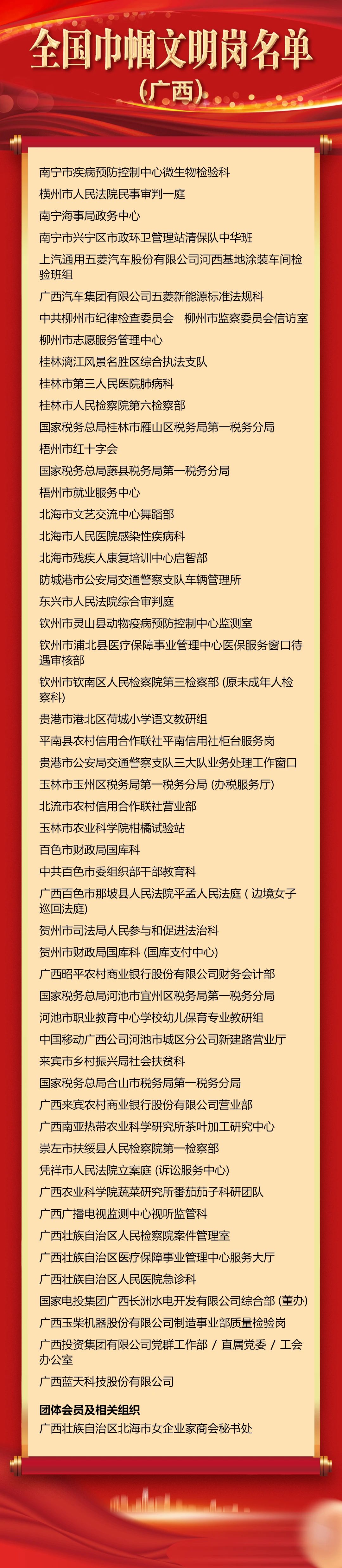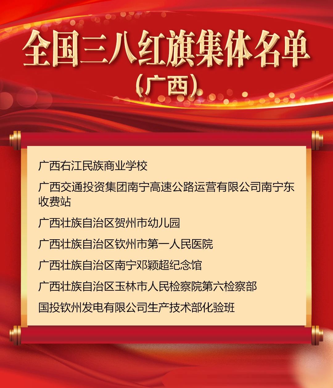 廣西獲獎的個人和集體當(dāng)中,陳曉軍等9人被授予全國三八紅旗手稱號;廣西右江民族商業(yè)學(xué)校等7個集體被授予全國三八紅旗集體稱號;南寧市疾病預(yù)防控制中心微生物檢驗科等54個集體被授予全國巾幗文明崗稱號;陳子麗等26人被授予全國巾幗建功標(biāo)兵稱號;南寧市社會福利院等15個集體被授予全國巾幗建功先進集體稱號。